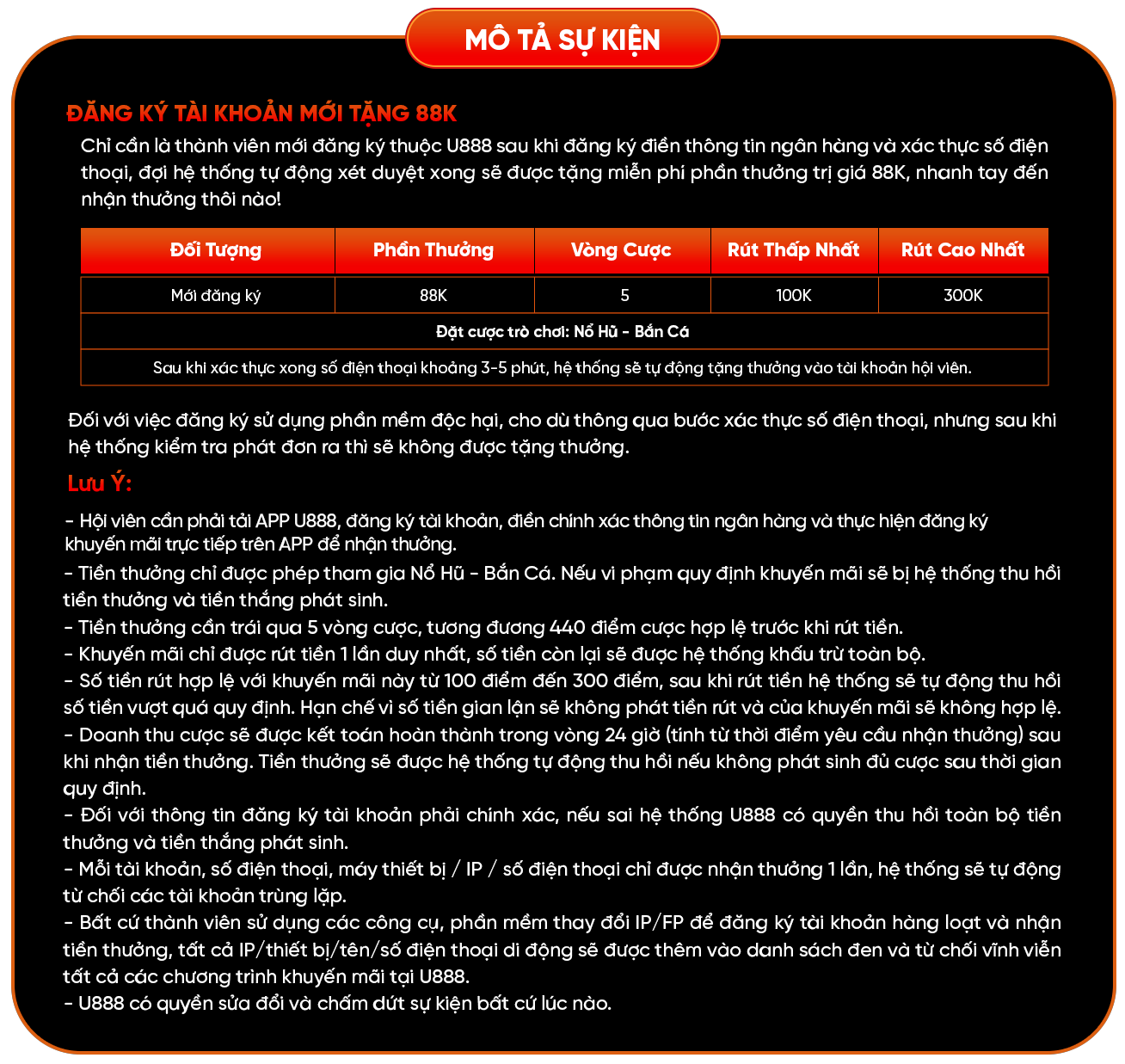 Hội viên cần phải tải APP U888, đăng ký tài khoản, điền chính xác thông tin ngân hàng và thực hiện đăng ký khuyến mãi VIP88K trực tiếp trên APP để nhận thưởng